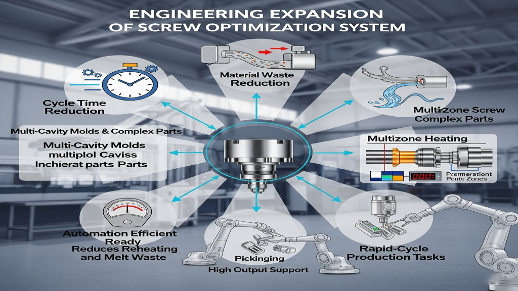 Optimizing screws goes beyond plasticizing—it extends to cycle time, energy use, and automation compatibility. A well-engineered screw system significantly reduces molding cycle and material waste. For multi-cavity molds and complex parts, high-response screw structures are essential.